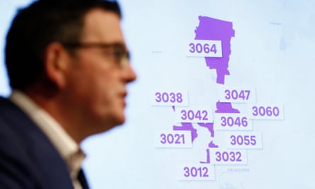 Postcodes of Melbourne suburbs are seen on a television screen as Victorian Premier Daniel Andrews speaks to media during a press conference in Melbourne on Tuesday. Victorians expected to be in lockdown for a few more weeks. These observations have not been quality controlled.